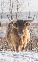 Een prachtige Schotse Hooglander, met een gemengde kleur van een bruine en een blonde Hooglander, staat relaxed in de sneeuw, precies de temperatuur waar ze zo van houden. Grazen kan nu even niet, dus dan kijken ze maar een beetje rond, precies waar ik als fotograaf zo van houd. Lekker met het zonnetje er bij, wat wil je nog meer. Deze foto is gemaakt in een natuurgebied in Noord-Brabant in Nederland.