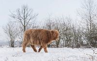 Een jonge Schotse Hooglander, een puber, loopt door het met sneeuw bedekte landschap. Dit is precies de temperatuur waar ze zo van houden. Grazen lukt niet zo goed dus dan lopen ze maar wat rond en kijken ze om zich heen, precies waar ik als fotograaf zo van houd. Hun rood bruine kleur steekt mooi af tegen de witte sneeuw, dit geeft een mooi contrast bij deze prachtige grote grazers. Deze foto is gemaakt in een natuurgebied in Noord-Brabant in Nederland.