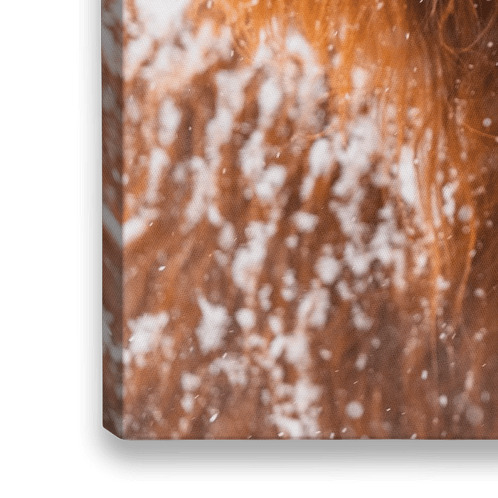 Portret van een Schotse Hooglander in de sneeuw in de winter. De Schotse Hooglanders worden gebruikt in het natuurbehoud van de Veluwe om ervoor te zorgen dat de heidegebieden niet dichtbegroeid raken.