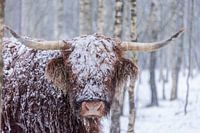 Portret van een Schotse Hooglander in de sneeuw, op een koude winterse dag, in natuurgebied Huis ter Heide bij Tilburg. Het natuurgebied wordt beheerd door Natuurmonumenten.