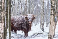 Een Schotse Hooglander in het bos in de sneeuw, op een koude winterse dag, in Huis ter Heide bij Tilburg. Het natuurgebied wordt beheerd door Natuurmonumenten.