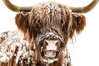 Portret van een Schotse Hooglander in de sneeuw tijdens de winter. De Schotse Hooglanders worden ingezet bij het natuurbeheer op de Veluwe om ervoor te zorgen dat heidegebieden niet dichtgroeien.