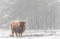 Portret van een Schotse Hooglander in de sneeuw tijdens de winter. De Schotse Hooglanders worden ingezet bij het natuurbeheer op de Veluwe om ervoor te zorgen dat heidegebieden niet dichtgroeien.