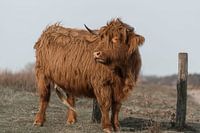 Een Schotse Hooglander staat in de wind in natuurgebied Huis ter Heide in De Moer in Nederland. Het gebied wordt beheerd door Natuurmonumenten.