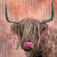 Digital kunst van een Schotse Hooglander. Doormiddel van diversen kleur penseel streken en patronen is het werk in een vrolijk jasje gezet.