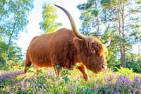 Schotse Hooglander tijdens zonsondergang over de bloeiende gewone heideplanten (Calluna vulgaris) in het Veluwse natuurgebied op de Wezepsche heide in Gelderland, Nederland.