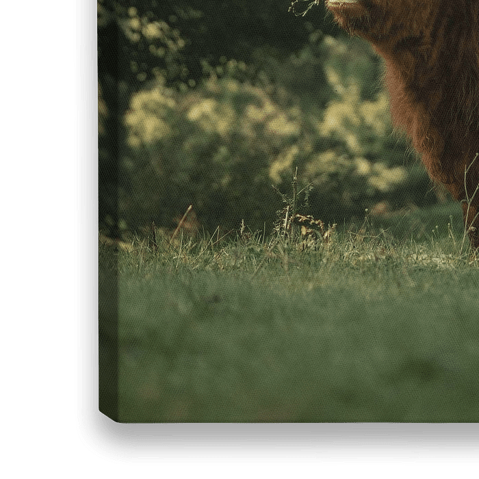Koop dit landschapskunstwerk Schotse Hooglander in groene omgeving met grassprietje in zijn bek van Eline Doornbos op canvas, aluminium dibond, (ingelijste) fotoprint, behang en ArtFrame, op maat geprint in Fine-Art kwaliteit.