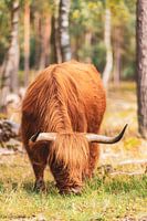 Schotse Hooglander graast tijdens een mooie zomerdag tussen de bomen in het Gelderse natuurgebied de Veluwe.