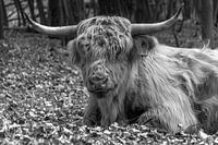Een zwart wit foto van een Schotse Hooglander, liggend in het bos van Kennemerland in Noord-Holland