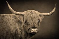 Portret foto van een stoere schotse hooglander digitaal bewerkt met een egale achtergrond in een warme sepia tint.
