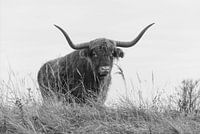 Zwart-wit portret van een stoere, robuuste, nieuwsgierige Schotse Hooglander, in natuurgebied Dintelse Gorzen in Noord-Brabant in Nederland.
