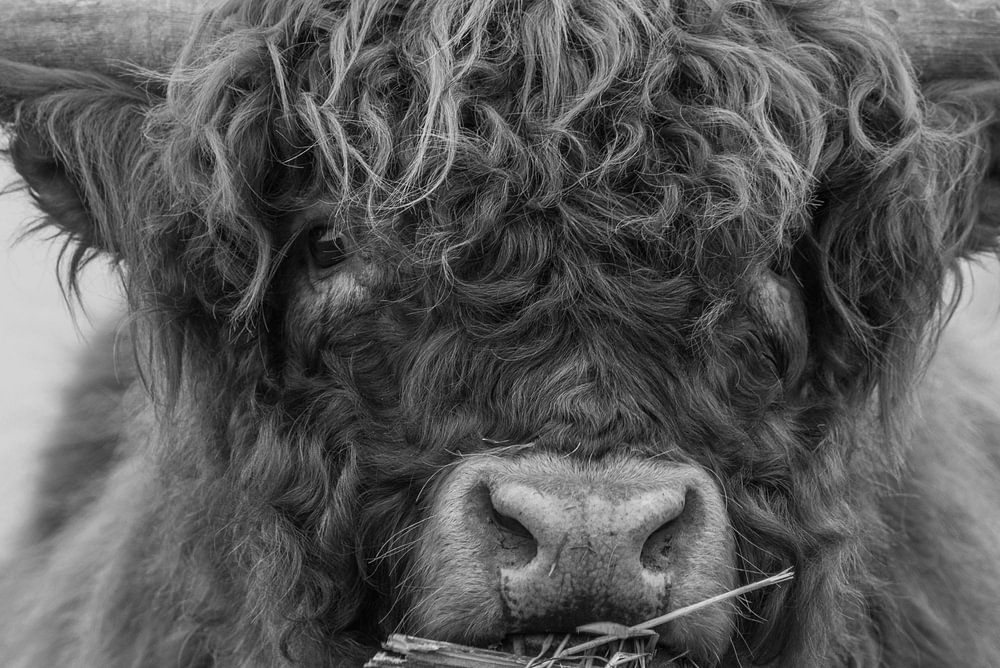 Een portret van een Schotse Hooglander in zwart wit, die hooi eet, in natuurgebied Slikken van Flakkee op het eiland Goeree-Overflakkee in Zuid-Holland in Nederland.