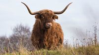 Een stoere, robuuste, nieuwsgierige Schotse Hooglander kijkt in de verte, in natuurgebied Dintelse Gorzen in Noord-Brabant in Nederland.