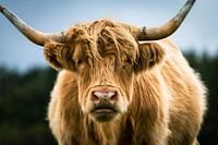 Een schotse hooglander die interesse toont voor de camera en kijkt ook recht in de lens.