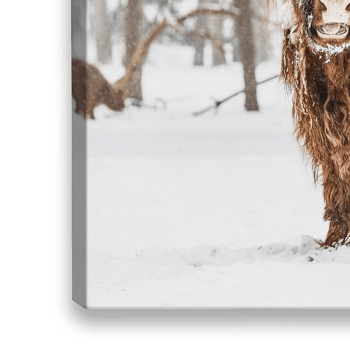 Portret van een Schotse Hooglander koe en kalf in de sneeuw in een bos tijdens de winter. De Schotse Hooglanders of Highlandrunderen worden ingezet bij het natuurbeheer op de Veluwe om ervoor te zorgen dat heidegebieden niet dichtgroeien.