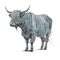 Deze lijntekening van een Schotse hooglander koe is een abstracte weergave van het boerderijdier, waarbij het lijkt of het beest is opgebouwd uit draad of touw. Het lijnenspel omhuld het dier waardoor het vorm krijg. De koe zelf is wit grijs en afgebeeld tegen een witte achtergrond, vierkant afdrukformaat.