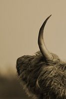 Deze foto van een Schotse Hooglander is even wat anders dan anders. Het laat de kenmerkende pose van een likkende Hooglander zien, maar dit keer zonder focus op de tong. Ik vond de hoorn namelijk zo prachtig uit komen, dat ik mij daarop gericht heb. Kijk naar de imposante punt en de behoorlijke afmeting van de hoorn. Daarom is voorzichtigheid zeker geboden bij deze dieren, ondanks dat ze zo sullig overkomen. Ik heb respect voor de horens van deze beesten, maar vindt ze zeer fascinerend om op de gevoelige plaat te zetten. Het heeft haast iets abstracts en kunstigs en zou in elk interieur een toegevoegde waarde hebben.