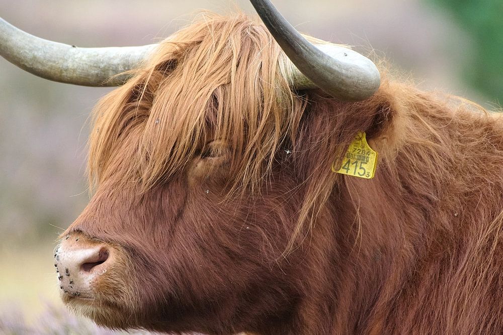 Prachtige schotse hooglander liggend op de paarse heide, prachtige horens