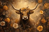 Deze majestueuze kunstafbeelding toont een hooglander met een sierlijke bloemenkroon, vergezeld door een vogel, temidden van een warme achtergrond vol gouden en crème bloemen. De rijke aardetinten en verfijnde details in de vacht en bloemen roepen een gevoel van rustieke luxe en natuurlijke harmonie op. Perfect voor liefhebbers van klassieke schoonheid en natuurkunst, brengt dit werk een warme en elegante sfeer naar elk interieur.