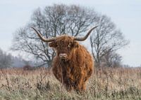 Een Schotse Hooglander staat voor een grote kale boom, op een koude winterdag, in natuurgebied Dintelse Gorzen in Noord-Brabant in Nederland.