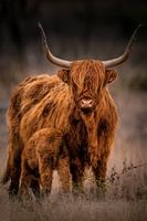 Prachtige schotse hooglander koe met een kalfje dat aan het drinken is.