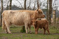 Een blonde Schotse Hooglander met haar kalfje. Het kalf wordt met veel liefde verzorgt en beschermd door haar moeder en als heel de kudde bij elkaar is worden de kalfjes door heel de kudde beschermd. Deze kudde leeft in een natuurgebied in Noord-Brabant in Nederland en wordt beheerd door Natuurmonumenten.