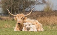 Een blonde Schotse Hooglander, met haar blond kalfje, liggen samen lekker in de zon in natuurgebied Huis ter Heide in De Moer in Nederland. Het gebied wordt beheerd door Natuurmonumenten.