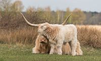 Een blonde Schotse Hooglander, met blond kalfje, is liefdevol naar haar kalf, in natuurgebied Huis ter Heide in De Moer in Nederland. Het gebied wordt beheerd door Natuurmonumenten.