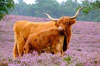 Schotse Hooglander met kalf in een bloeiend heideveld tijdens een zomerse dag op de Veluwe. De Hooglanders begrazen het natuurgebied zodat de heide meer kans krijgt om te groeien.