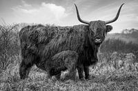 Foto van een Schotse Hooglander koe met kalfje die bij zijn moeder drinkt in zwart-wit
