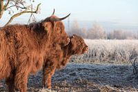Een Schotse Hooglander met kalf, op een zonnige winterdag, in natuurgebied Huis ter Heide in Nederland. Het natuurreservaat wordt beheerd door Natuurmonumenten.