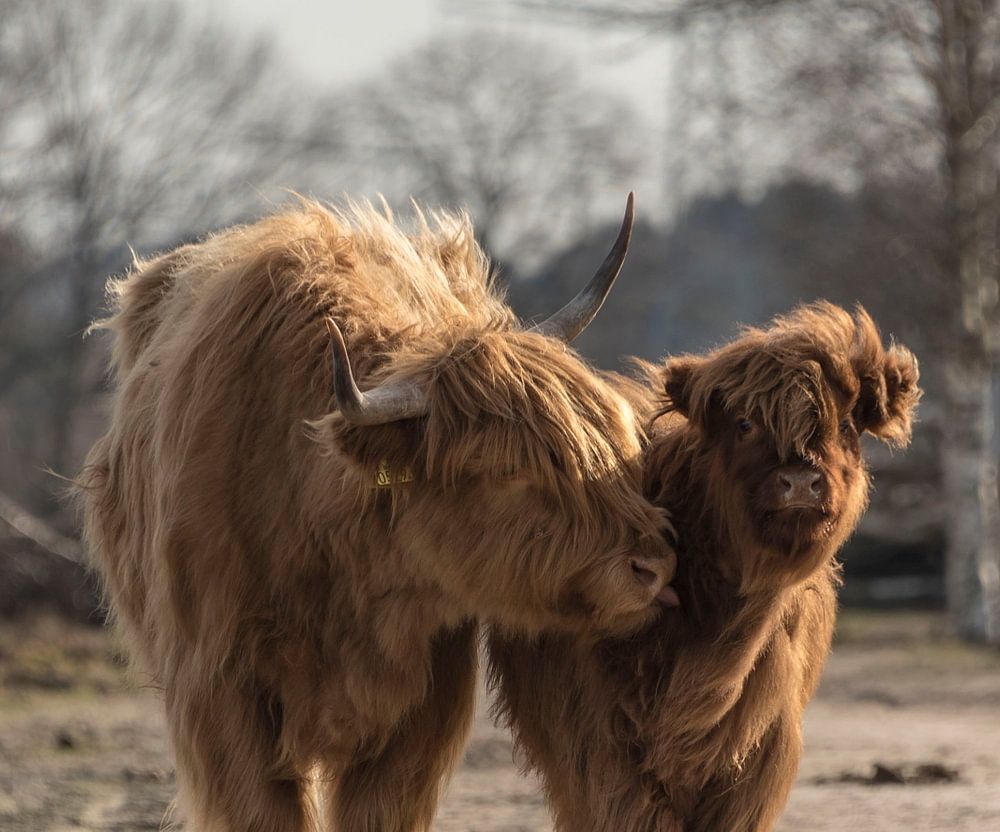 Een Schotse Hooglander verzorgt haar kalf met liefde, in natuurgebied Huis ter Heide in De Moer in Nederland. Het gebied wordt beheerd door Natuurmonumenten.