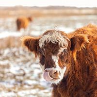 Schotse Hooglander (nadruk op kop) met tong in neusgat in het winterzonnetje. In de achtergrond nog een Schotse Hooglander. Foto is in het vierkant.