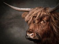 Portret foto van een schotse hooglander koe gecombineerd met een geschilde achtergrond op canvas in warme kleuren.