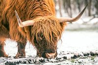 Portret van een Schotse Hooglander in de sneeuw tijdens de winter. De Schotse Hooglanders worden ingezet bij het natuurbeheer op de Veluwe om ervoor te zorgen dat heidegebieden niet dichtgroeien.