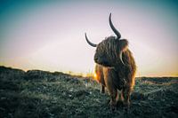Kleurenfoto van een van de majestueuze Schotse Hooglanders tijdens zonsondergang in de winterse Texelse Duinen nabij Paal 9.