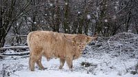 Een Schotse hooglander, een blonde stier, staat in een besneeuwd landschap. Het sneeuwt, de sneeuwvlokken dwarrelen nog naar beneden, maar dat deert hem niet, met zijn dikke vacht en zijn lange haren heeft hij geen last van de kou, dit is juist een ideale temperatuur voor deze dieren. Deze Schotse hooglander stier hoort bij een grote…