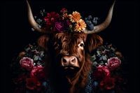 Een donkere intieme sfeer met een mooi lichtinval op de Schotse Hooglander en de bloemenpracht.