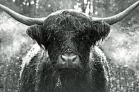 Een Schotse Hooglander na een regenbui in zwart wit. Een van de grootste zoogdieren die in Nederland in de natuur leeft. Een prachtig dier om te zien, te fotograferen en om aan je muur te hebben.