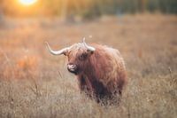 Zonsondergang, mooie zachte gouden kleuren, kleine lensflare. En een prachtige schotse hooglander