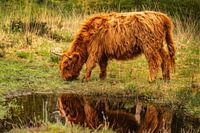 Prachtige rood-bruine schotse hooglander grazend in de natuur.