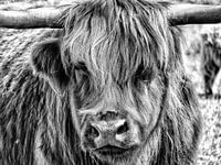 Een roodbruine Schotse Hooglander gespot in het Drentsche Aa in zwart-wit. Ook verkrijgbaar in kleur.