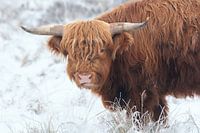 Schotse Hooglander in winter setting met sneeuw en rijp in nationaal park de Veluwezoom.