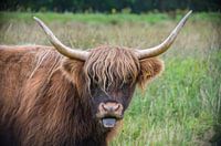 Schotse Hooglander steekt zijn tong uit in natuurgebied "De Pannenhoef" in Nederland.