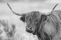 Een portret van de Schotse Hooglander in zwartwit.