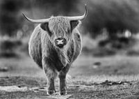 Een zwart-witfoto van een Schotse Hooglander lopend over een pad in de heide met in de achtergrond het bos