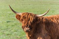 Schotse hooglander met zijn indrukwekkende kop en grote hoornen en de lange haren.