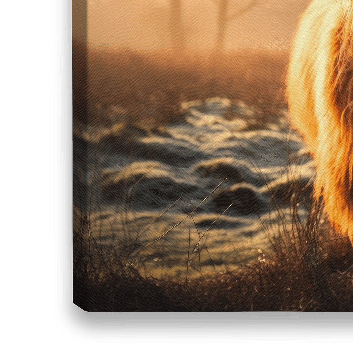 De Hooglander staat centraal in het beeld, met een directe blik die de kijker uitnodigt om de interactie aan te gaan. De indrukwekkende hoorns steken sterk af tegen de zachte achtergrond, waarin de contouren van bomen zichtbaar zijn door de oplichtende mist. De vacht van de Hooglander heeft een rijke, gouden tint, die extra benadrukt wordt door het zachte, diffuse licht.