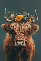 Dit vintage, trendy kunstwerk toont een innemende Schotse Hooglander, wiens hoofd sierlijk is getooid met een kleurrijke bloemenkrans.