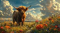 De koe, met zijn kenmerkende lange, ruige vacht en indrukwekkende horens, neemt een centrale plaats in binnen het schilderij, en kijkt rechtstreeks naar de toeschouwer met een kalme, doordringende blik. De achtergrond is gevuld met een dramatische hemel waarin zowel heldere als donkere wolken samensmelten, waardoor een dynamische en bijna theatrale sfeer ontstaat. Het licht speelt een cruciale rol in dit kunstwerk, met zonnestralen die door de wolken breken en het landschap in een gouden gloed zetten, waardoor de textuur van de vacht van de koe en de details van de bloemen extra benadrukt worden. Het veld zelf is een explosie van kleur, met een diversiteit aan bloemen in alle mogelijke kleuren die zorgen voor een gevoel van levensvreugde en natuurlijke rijkdom.